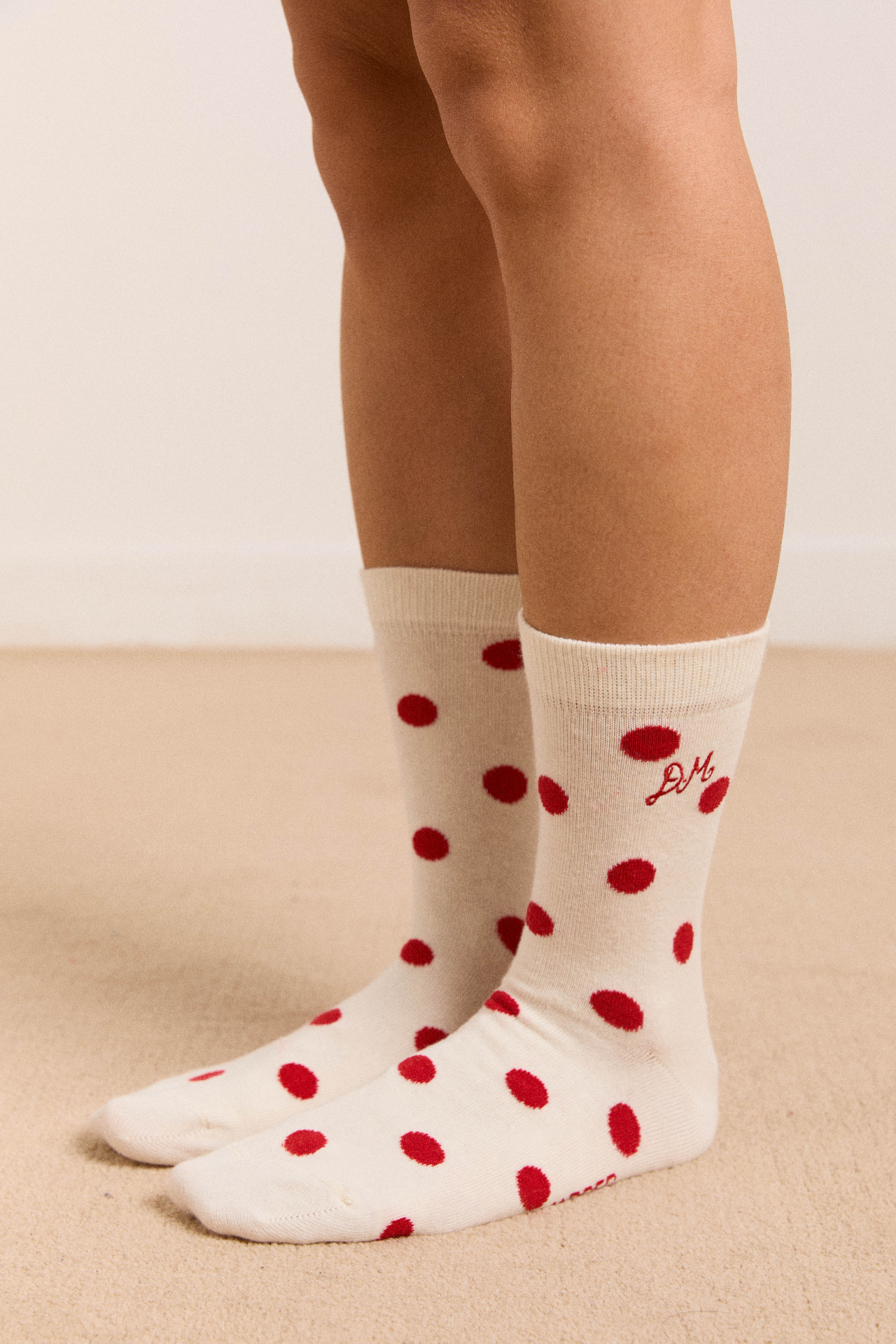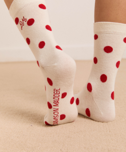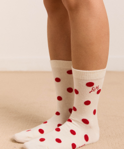 Meet our signature calf length socks in white and red polka dot print. Crafted from 75% organic cotton, 23% recycled nylon, and 2% elastane, offering a perfect blend of comfort, durability, and a touch of stretch. The soft, organic cotton ensures a gentle feel against the skin, while the nylon and elastane contribute to enhanced flexibility and shape retention.