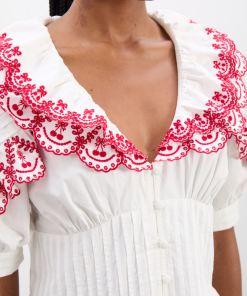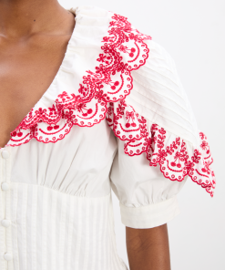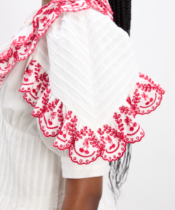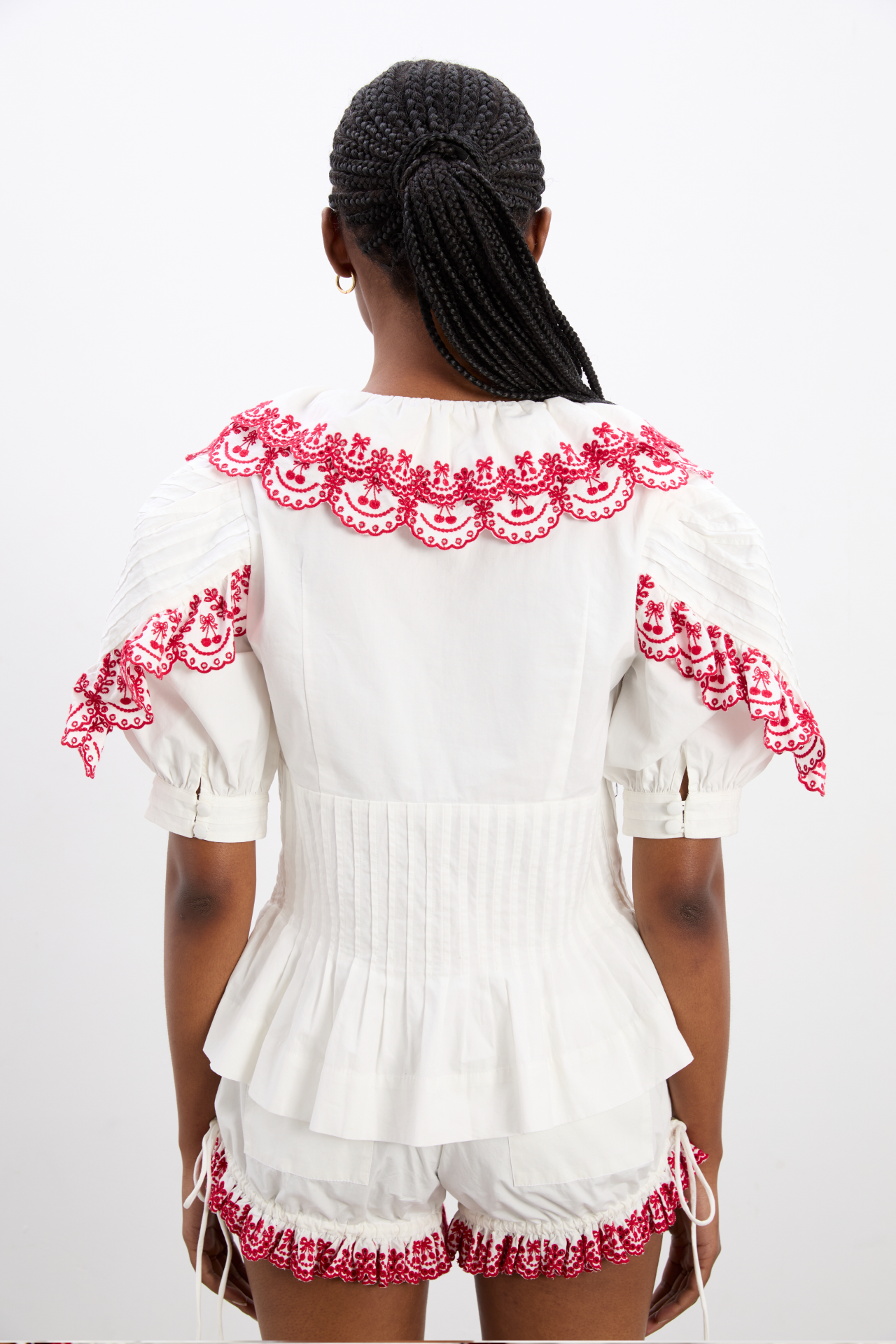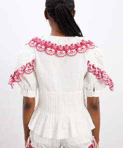The Caroline Blouse is the perfect combination of tailored and feminine. Adorned with cherry embroidered detailing and crafted with a pin-tuck bodice, button down front, puff sleeves and a small peplum hem, this 100% cotton blouse will be on repeat all summer long. Pair with the matching Jenna Bloomer Shorts for a playful summer co-ord.