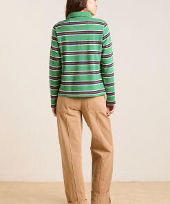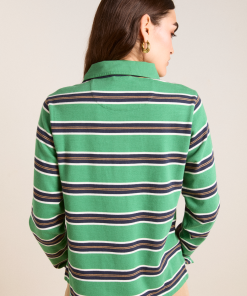Our best-selling rugby has been reimagined in a new shrunken fit. The Cassia Shrunken Rugby in green stripe fuses traditional sporty style with a modern silhouette. Made from 100% organic cotton, it features a button placket and woven collar. Finished with our signature DM embroidery detailing on the front.