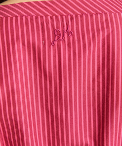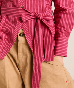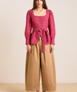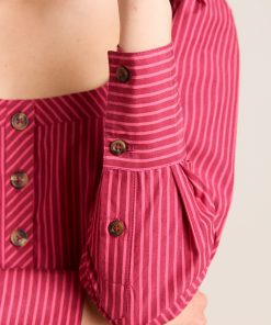 Meet the effortlessly wearable Clare Blouse. Crafted from 100% organic cotton in a striking berry business stripe, this blouse features a button up front with a flattering square neckline, and a removable belt to bring structure to the silhouette.