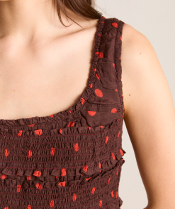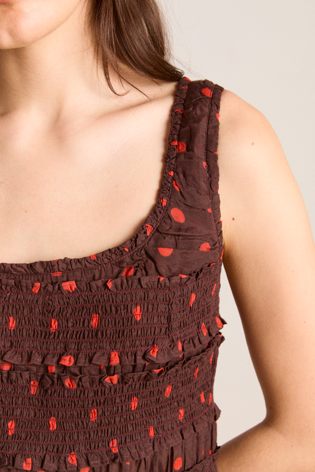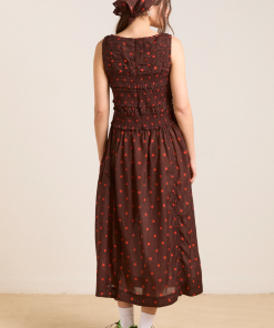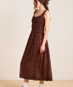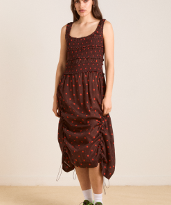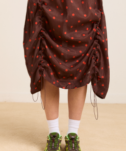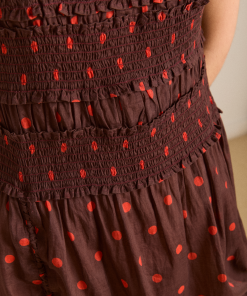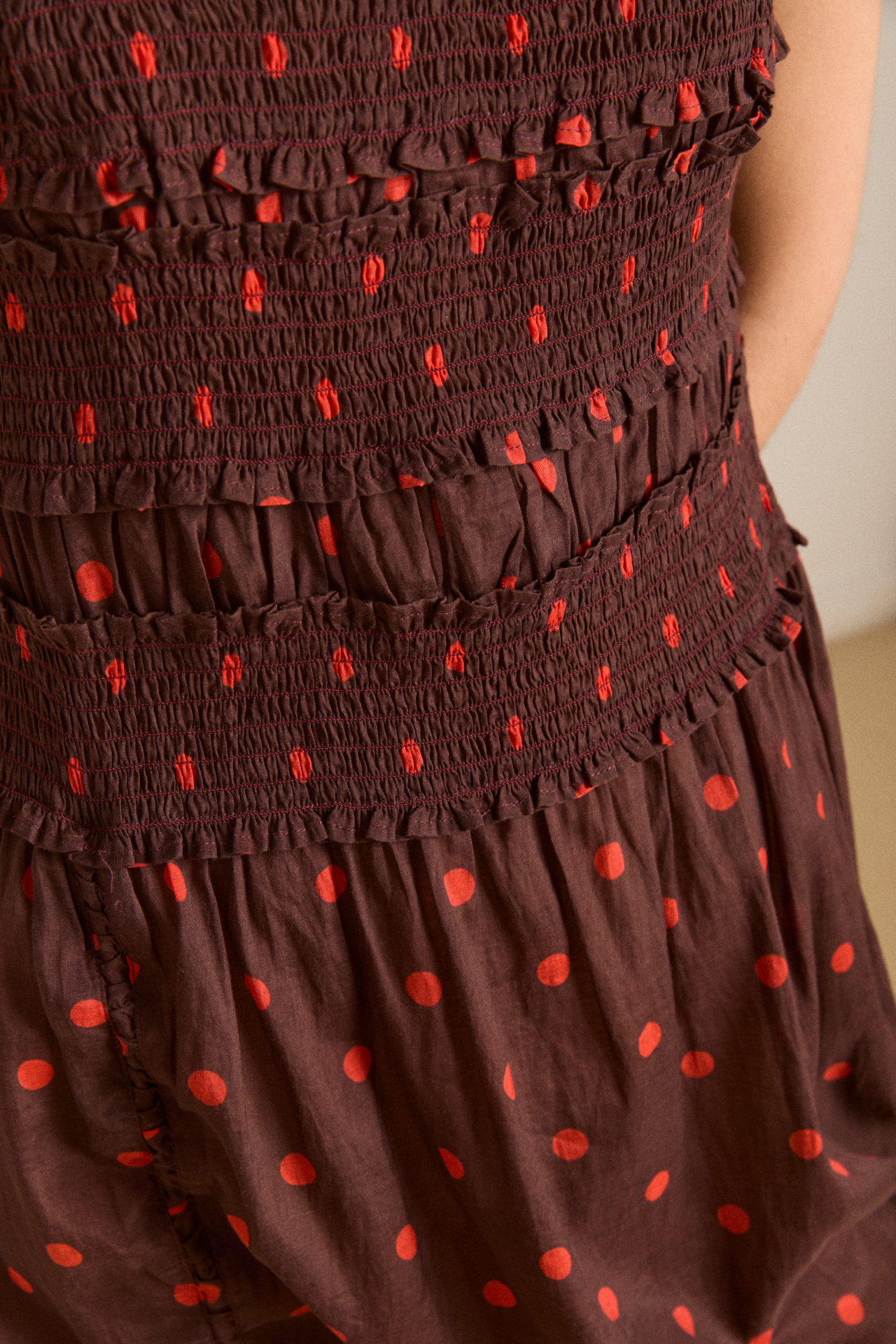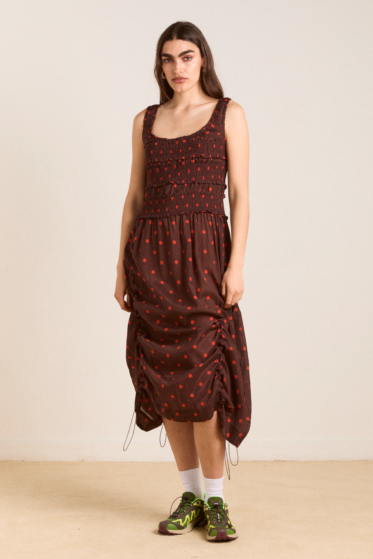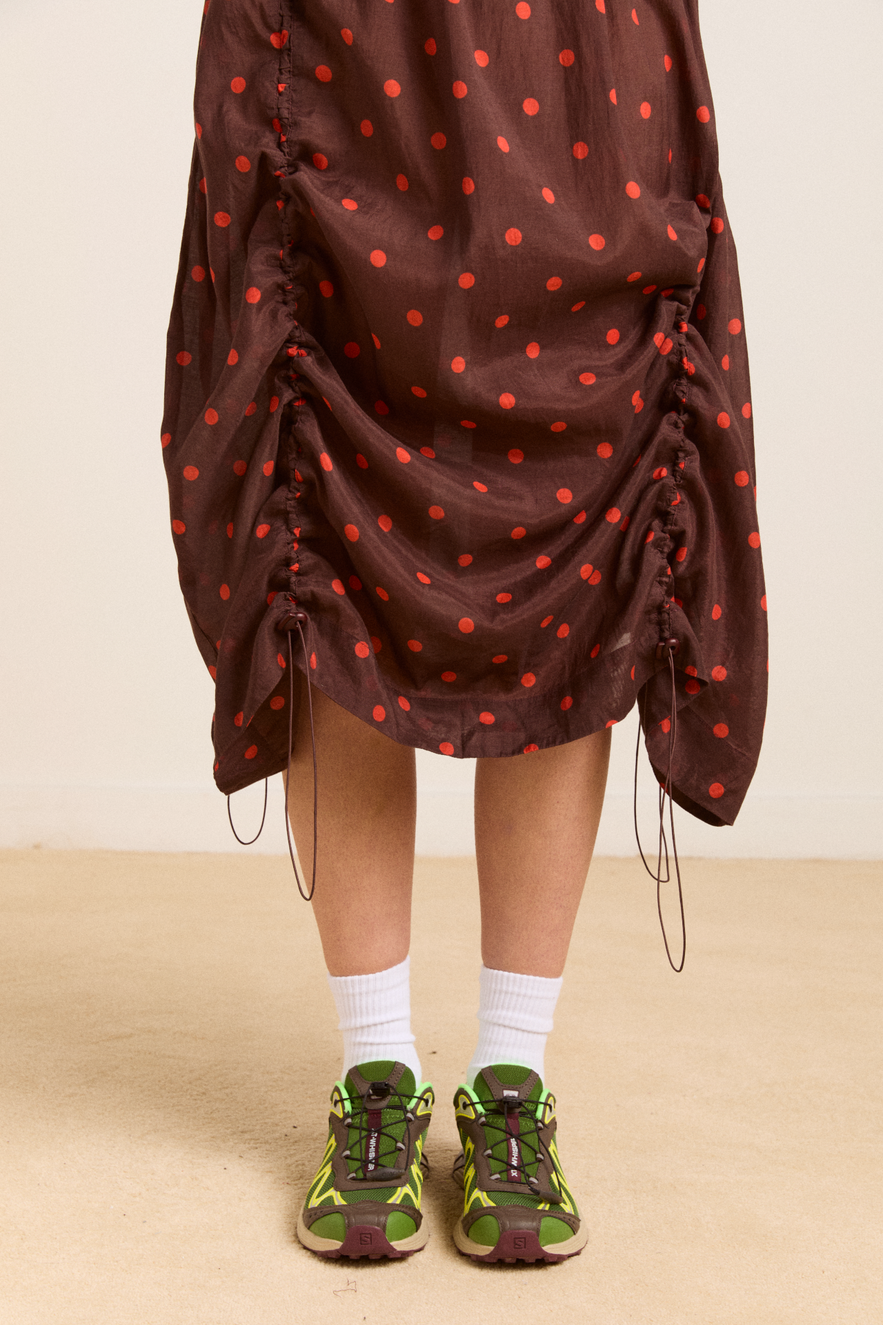 Meet the Cynthia Sheer Midi Dress in burg/red polka dot. Featuring a scoop neck, shirred bodice and adjustable toggles at the hem to create a ruched skirt. The perfect balance of structure and softness, this dress will be on repeat season after season. Matching accessories available.