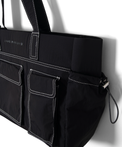 An elevated take on our signature DM tote bags, meet the Eliza Techy Tote Bag in black. This tote keeps all of your essentials secure and organised with its external front pockets and side toggle pockets, as well as an internal pocket and metal zipper closure to keep your valuables safe. Finished with white contrast stitching and rubberised Damson Madder branding, it is the ultimate everyday bag.