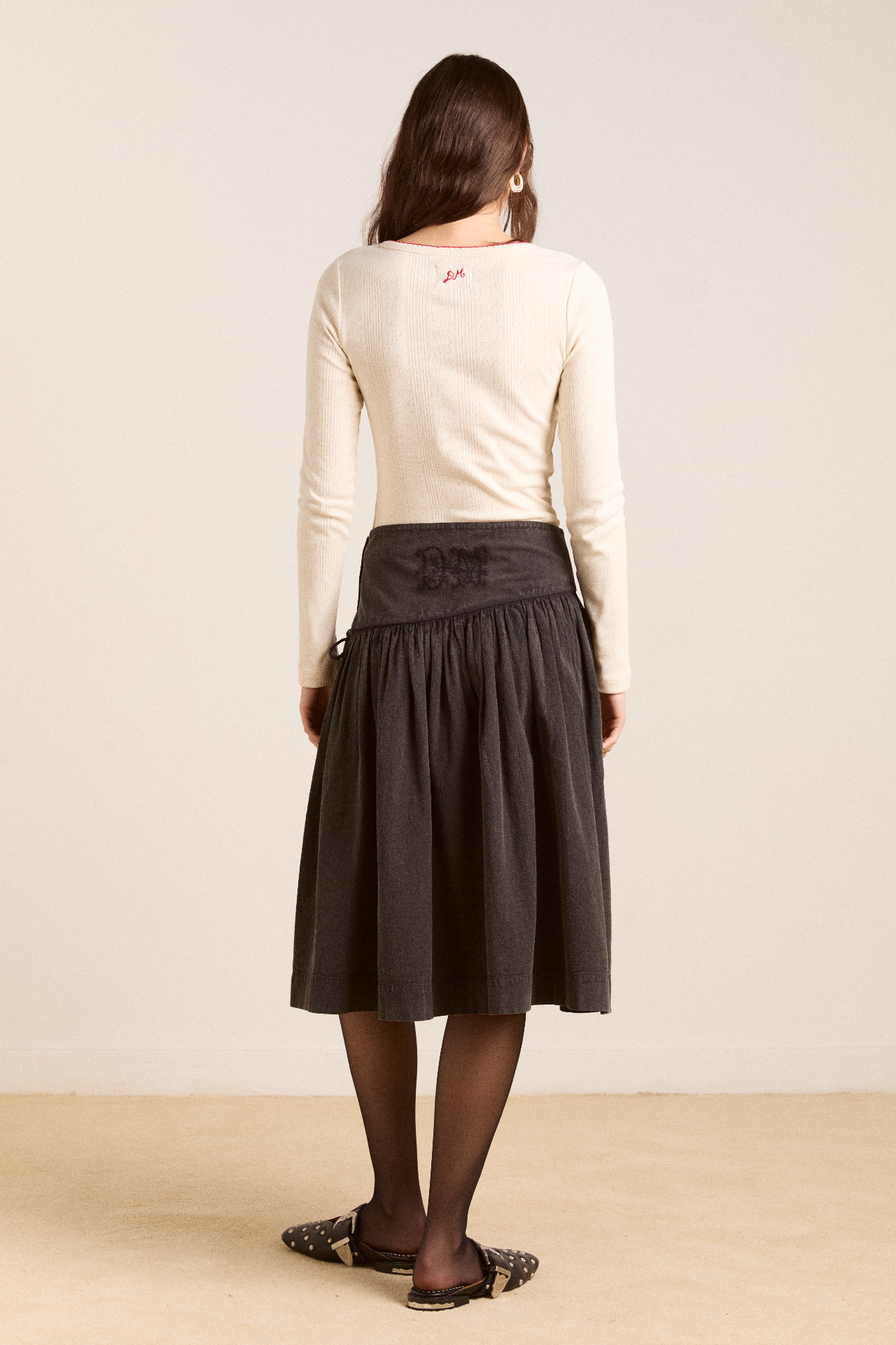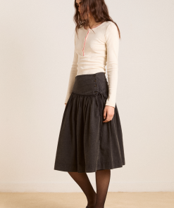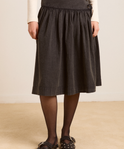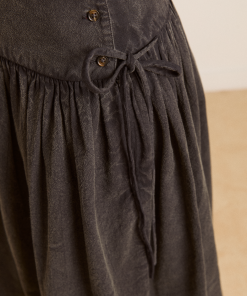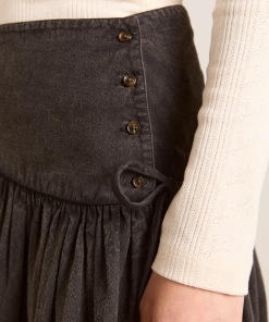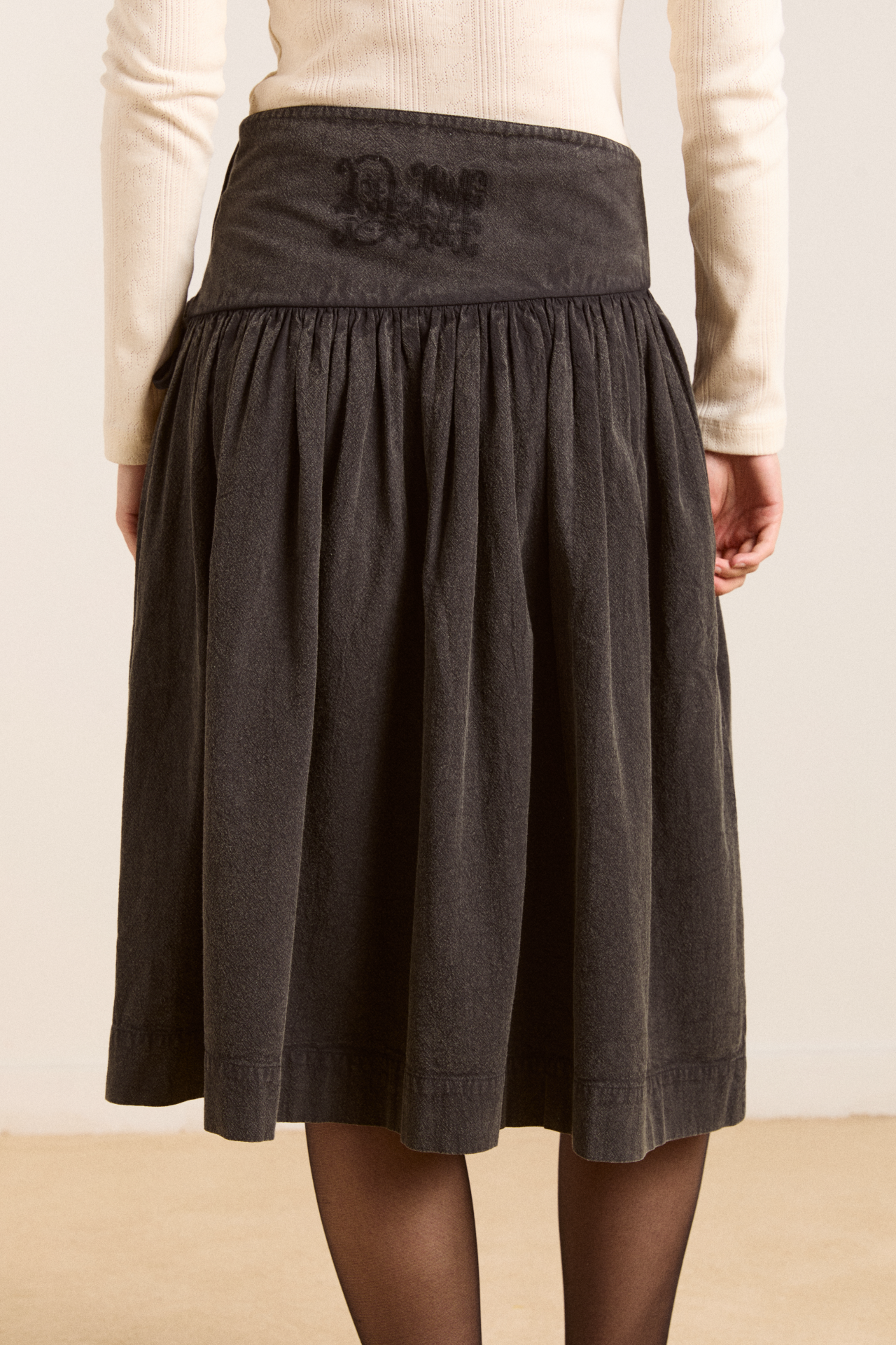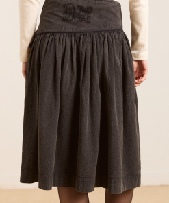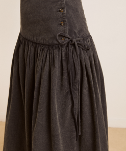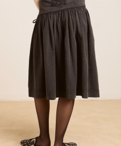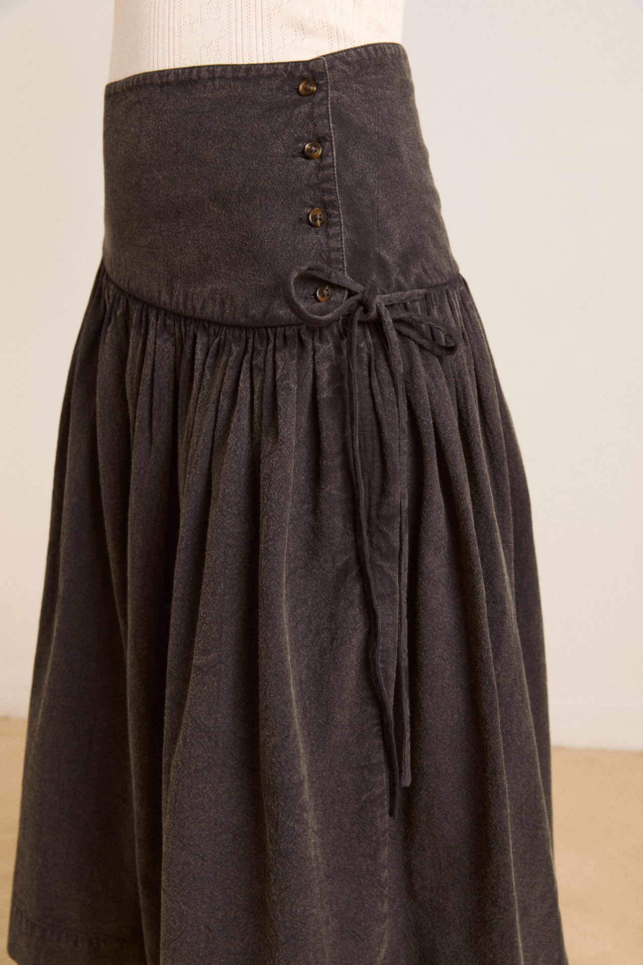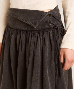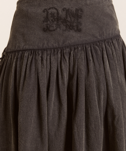 Crafted from 100% organic cotton, the Fia Volume Knee Length Skirt in carbon features a dropped waist and functional buttons and ties at the side seam. Finished off with custom DM embroidery on the back. Can be styled with the waist folded down.