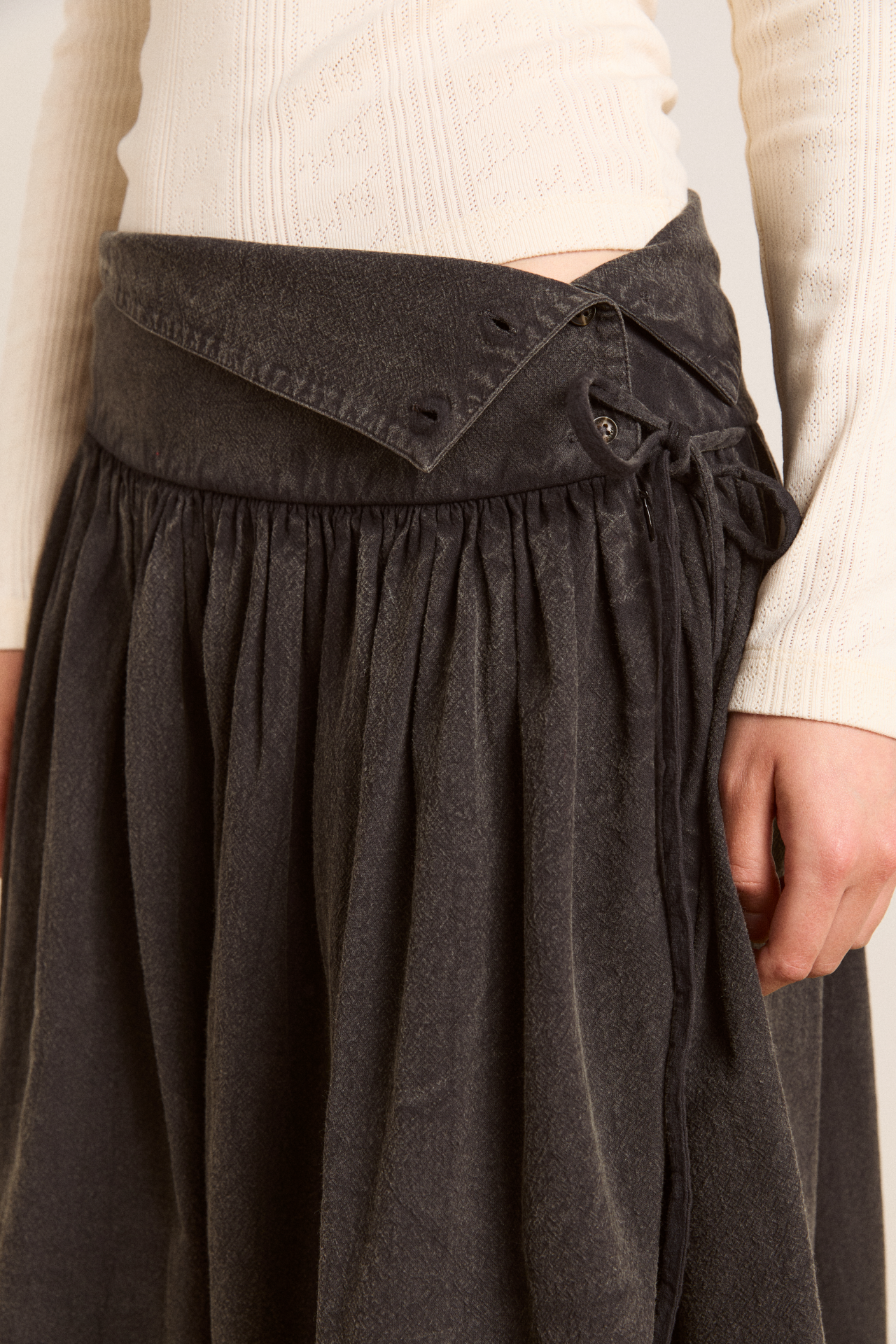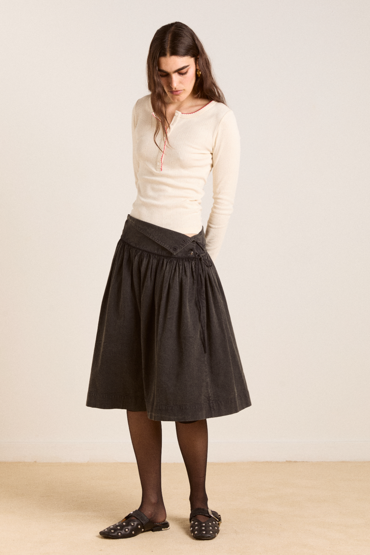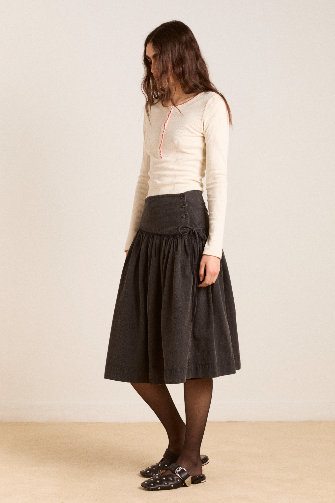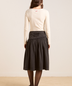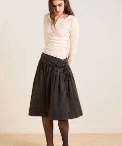 Crafted from 100% organic cotton, the Fia Volume Knee Length Skirt in carbon features a dropped waist and functional buttons and ties at the side seam. Finished off with custom DM embroidery on the back. Can be styled with the waist folded down.