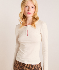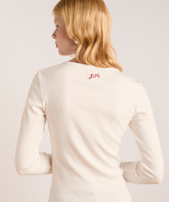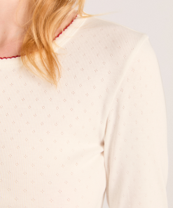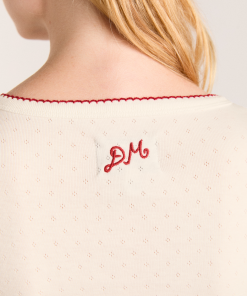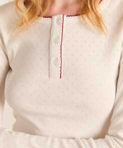 The long-sleeve you can wear with absolutely everything. The Hester Henley top in off white features a soft 100% organic cotton pointelle fabrication and slim-fitting silhouette with a crew neck and button placket. Finished with contrast red crochet trim and our signature DM embroidery detail on the back neck.