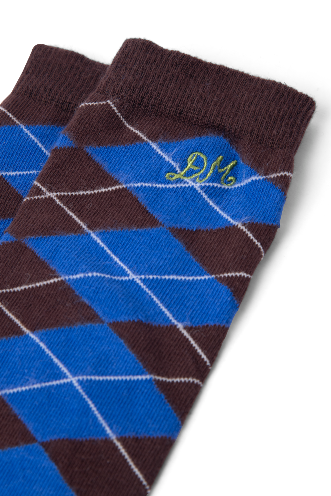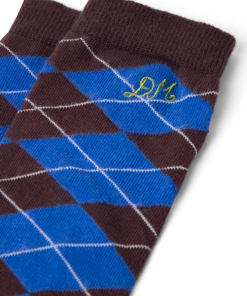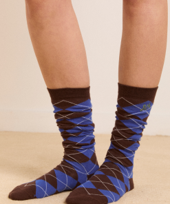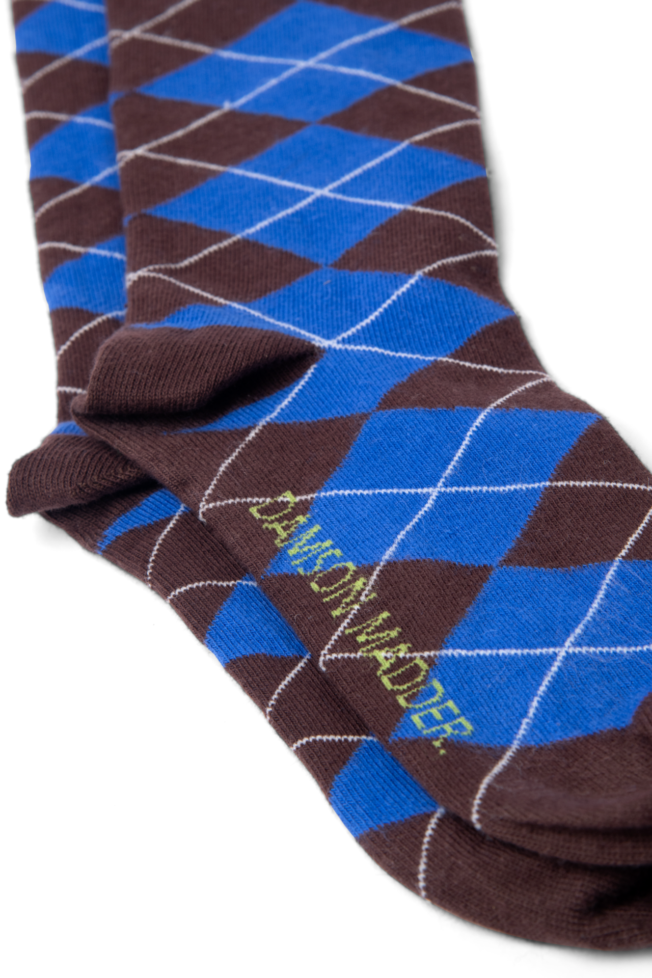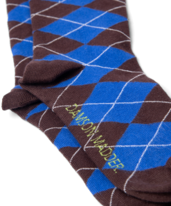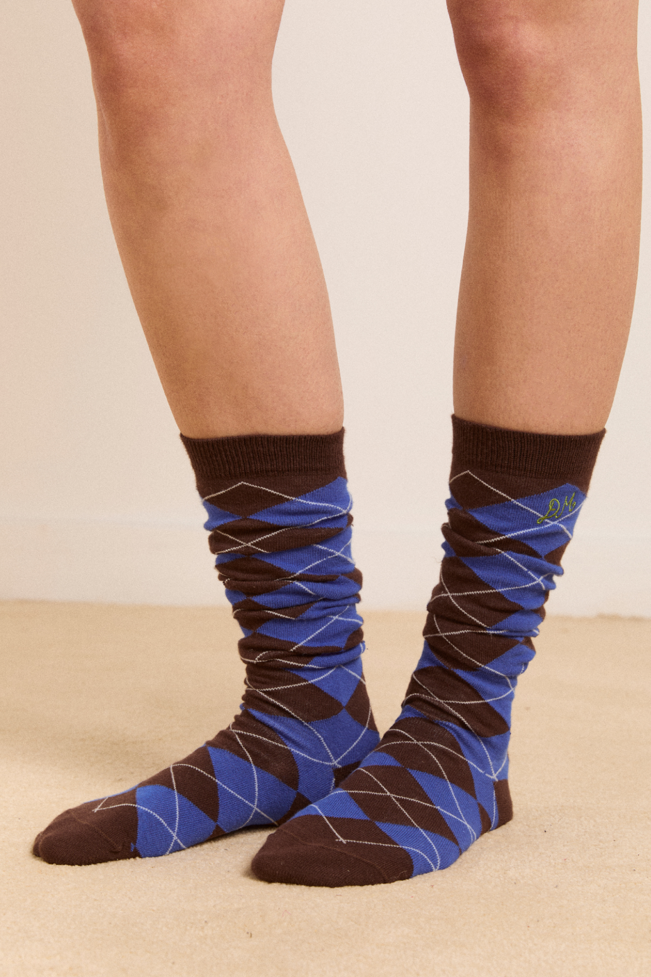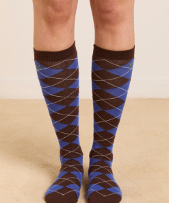 Our knee high socks boast a brown and cobalt argyle design. Wear knee high or scrunched for a relaxed look. The perfect finishing touch to any outfit.