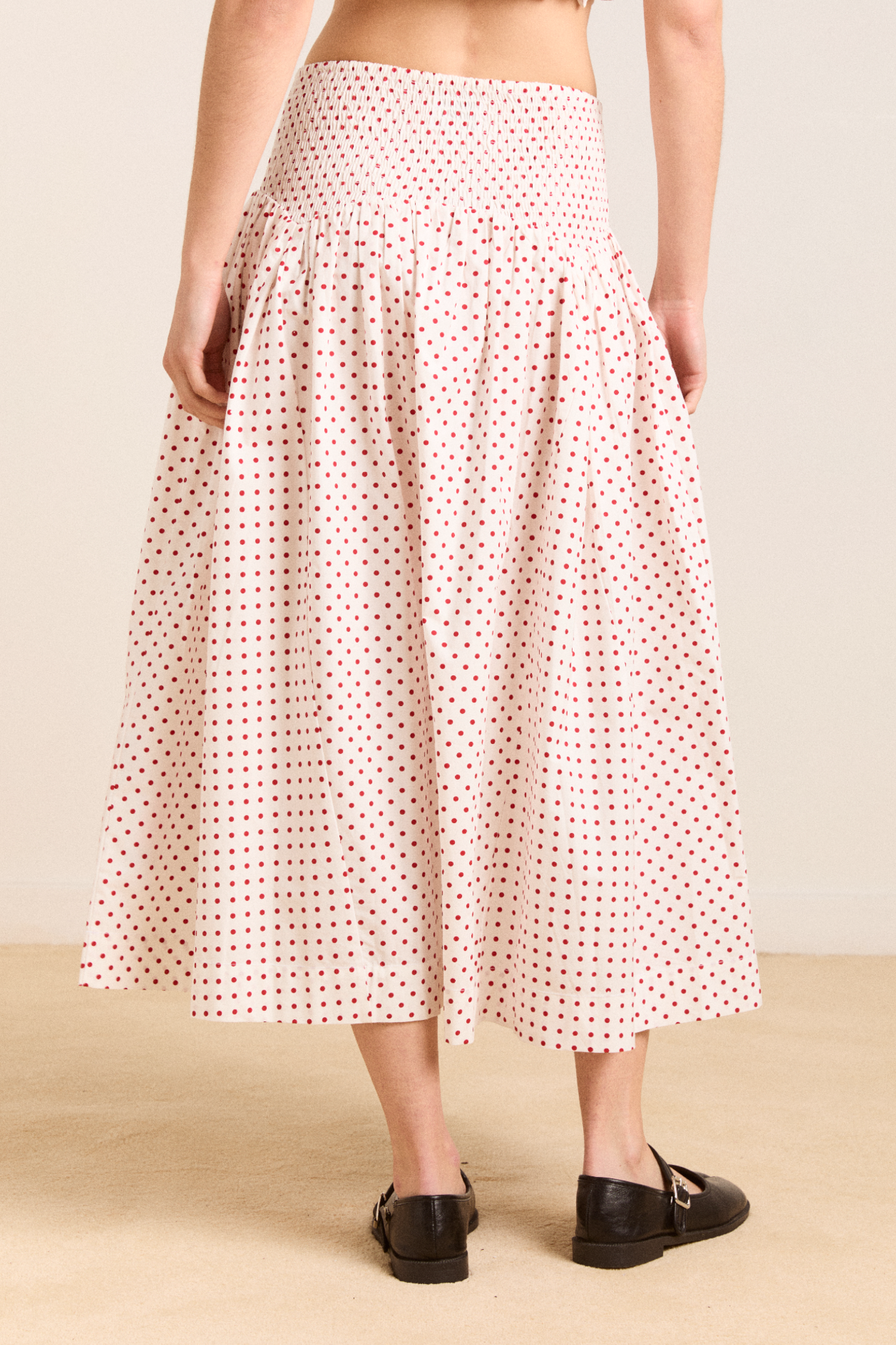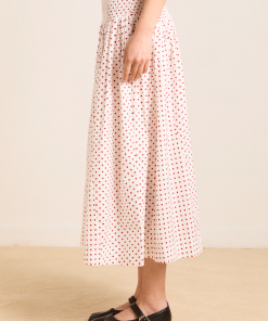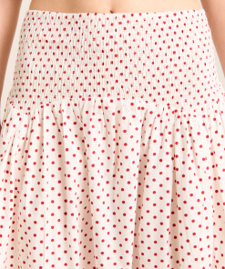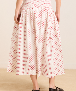 Falling to a midi length, the Layla Skirt in off white and red spot is a transeasonal staple. Featuring a dropped waist, with a shirred elasticated waistband, this skirt is comfortable and stylish. Pair with our Raphi Cami or Leilani Blouse for a full head to toe look.