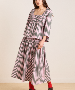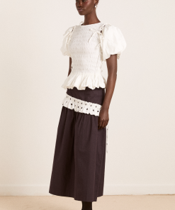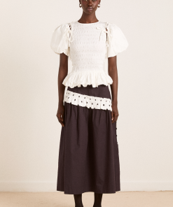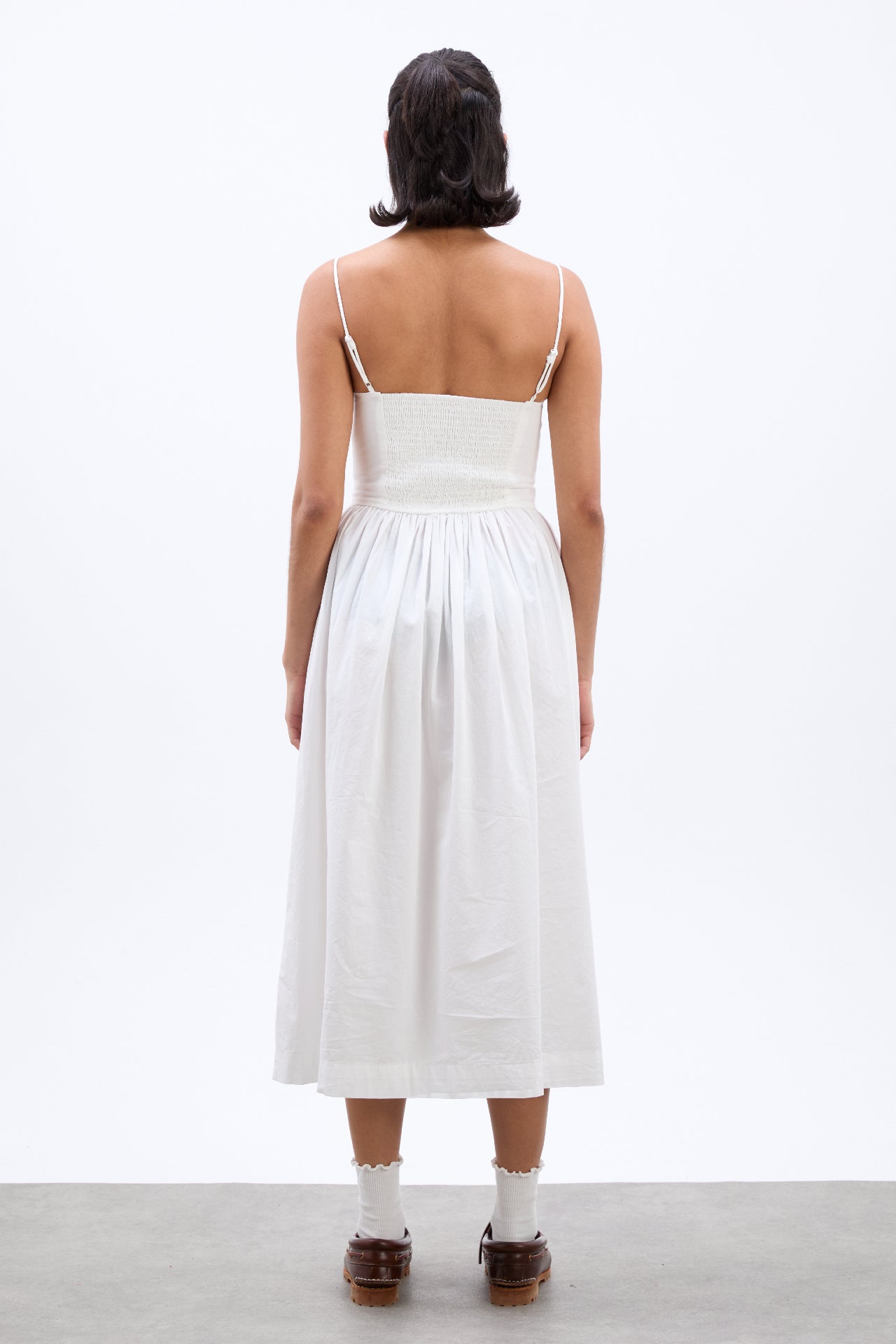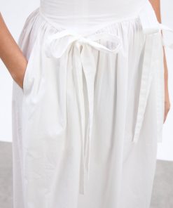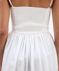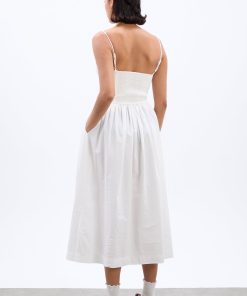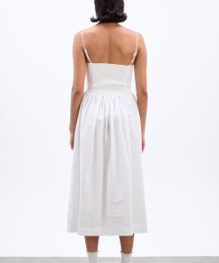 The Penelope apron dress is our white midi dress featuring a corset style bodice with waist seam details and bows that gather into a fuller skirt.
