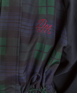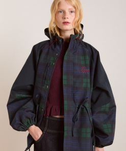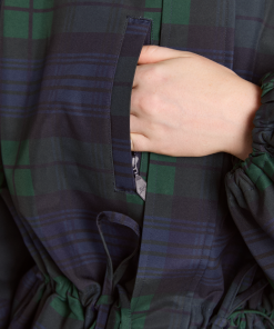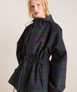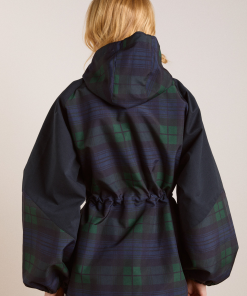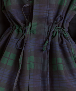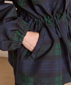 Meet our Liu Shower Resistant Raincoat. Crafted from recycled fabric in a custom navy check, the Liu offers a flattering silhouette with adjustable waist ties and cuffed balloon style sleeves. Elevated by our signature embroidered DM logo on the chest, an adjustable hood and smartly placed pockets. This piece is refined yet functional, designed to tackle any rainy day in style.