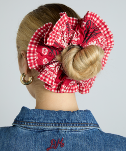 Our red bandana scrunchie features a gingham edge trim. We suggest pairing it with our Macy tote bag, available in the same print.
