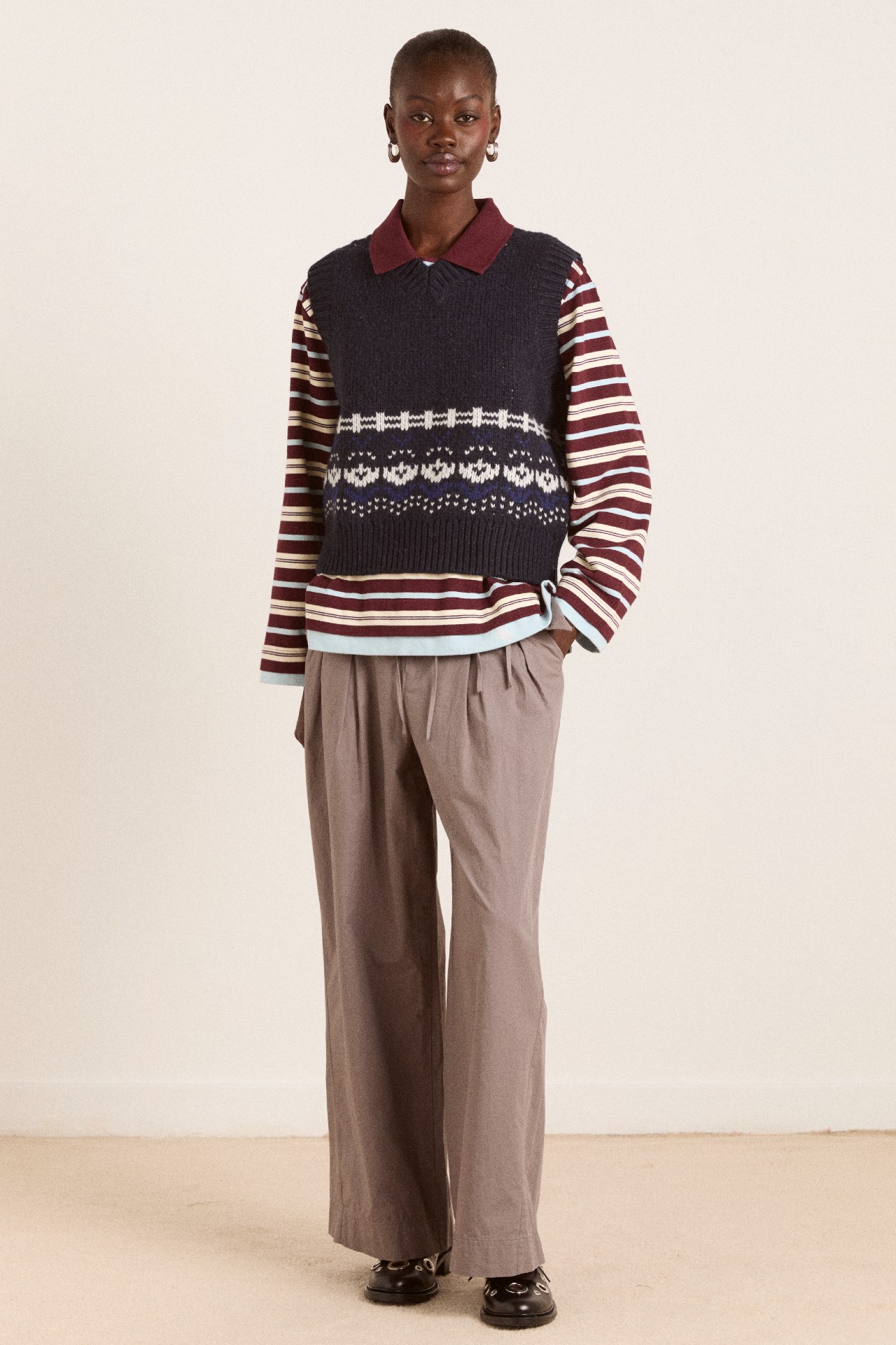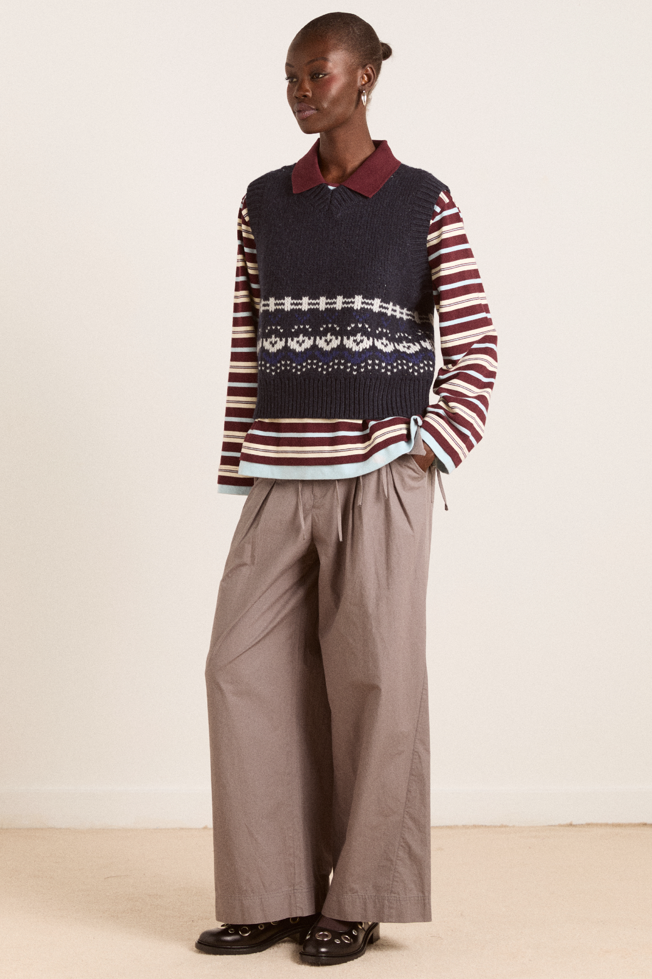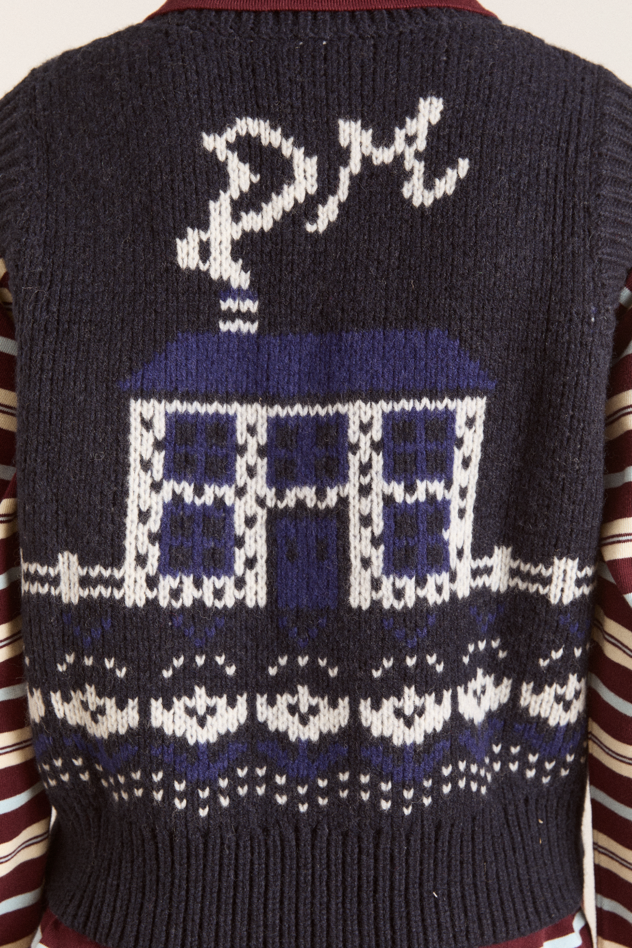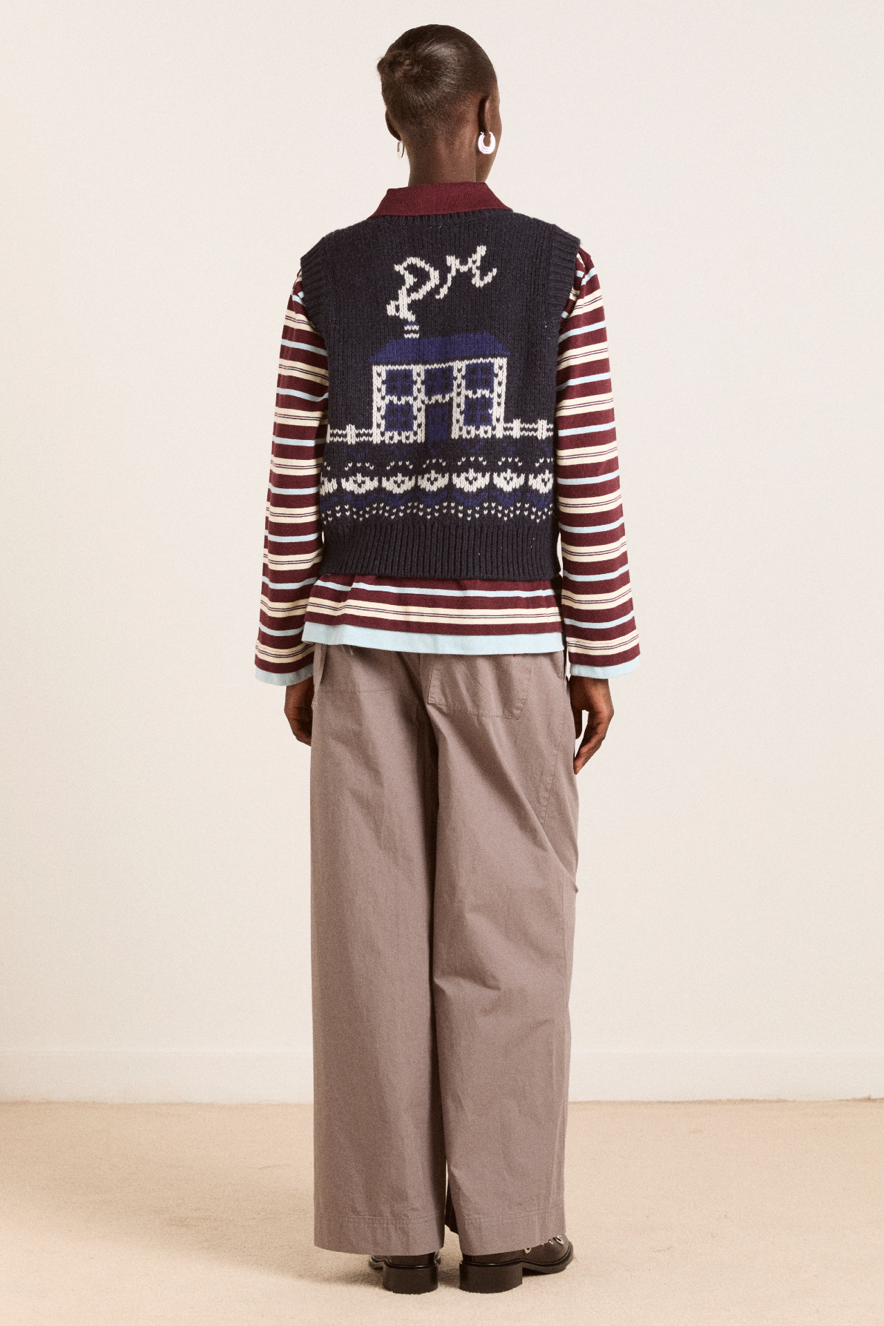 A modern staple with thoughtful detail, the Rhona Lambswool tank is a boxy-fit knit featuring a sharp V neckline and a minimalist front, whilst our DM house motif on the back adds a quiet touch of character. Crafted from 100% RWS-certified wool, it serves as a trans-seasonal wardrobe hero.