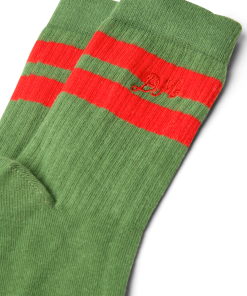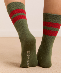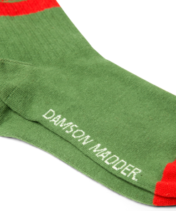 Meet our signature calf length socks in olive and red stripe print. Crafted from 75% organic cotton, 23% nylon, and 2% elastane, offering a perfect blend of comfort, durability, and a touch of stretch. The soft, organic cotton ensures a gentle feel against the skin, while the nylon and elastane contribute to enhanced flexibility and shape retention.