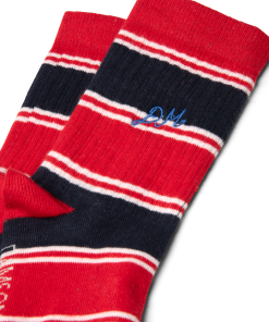Meet our signature calf length socks in red/navy multi stripe print. Crafted from 75% organic cotton, 23% nylon, and 2% elastane, offering a perfect blend of comfort, durability, and a touch of stretch. The soft, organic cotton ensures a gentle feel against the skin, while the nylon and elastane contribute to enhanced flexibility and shape retention.
