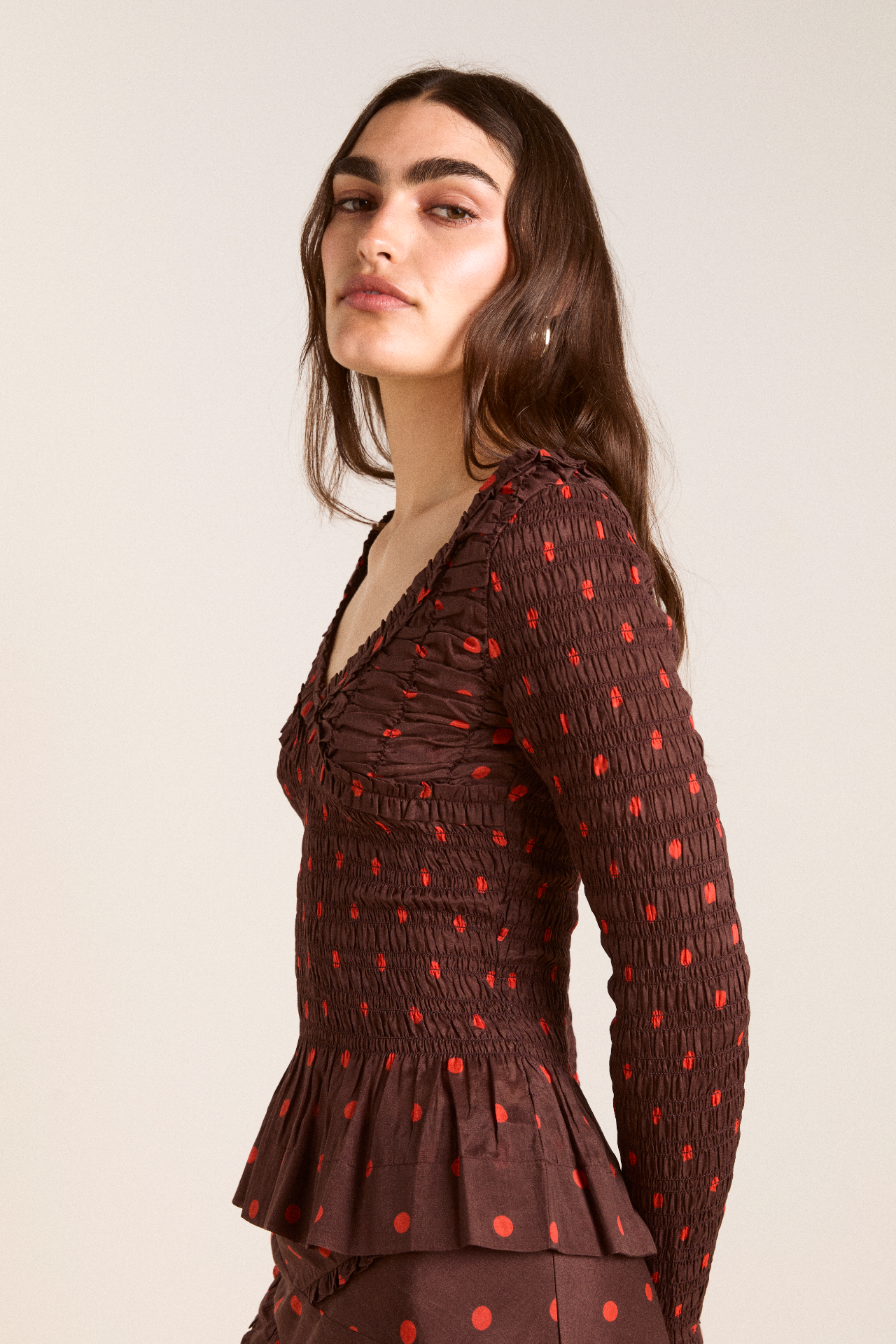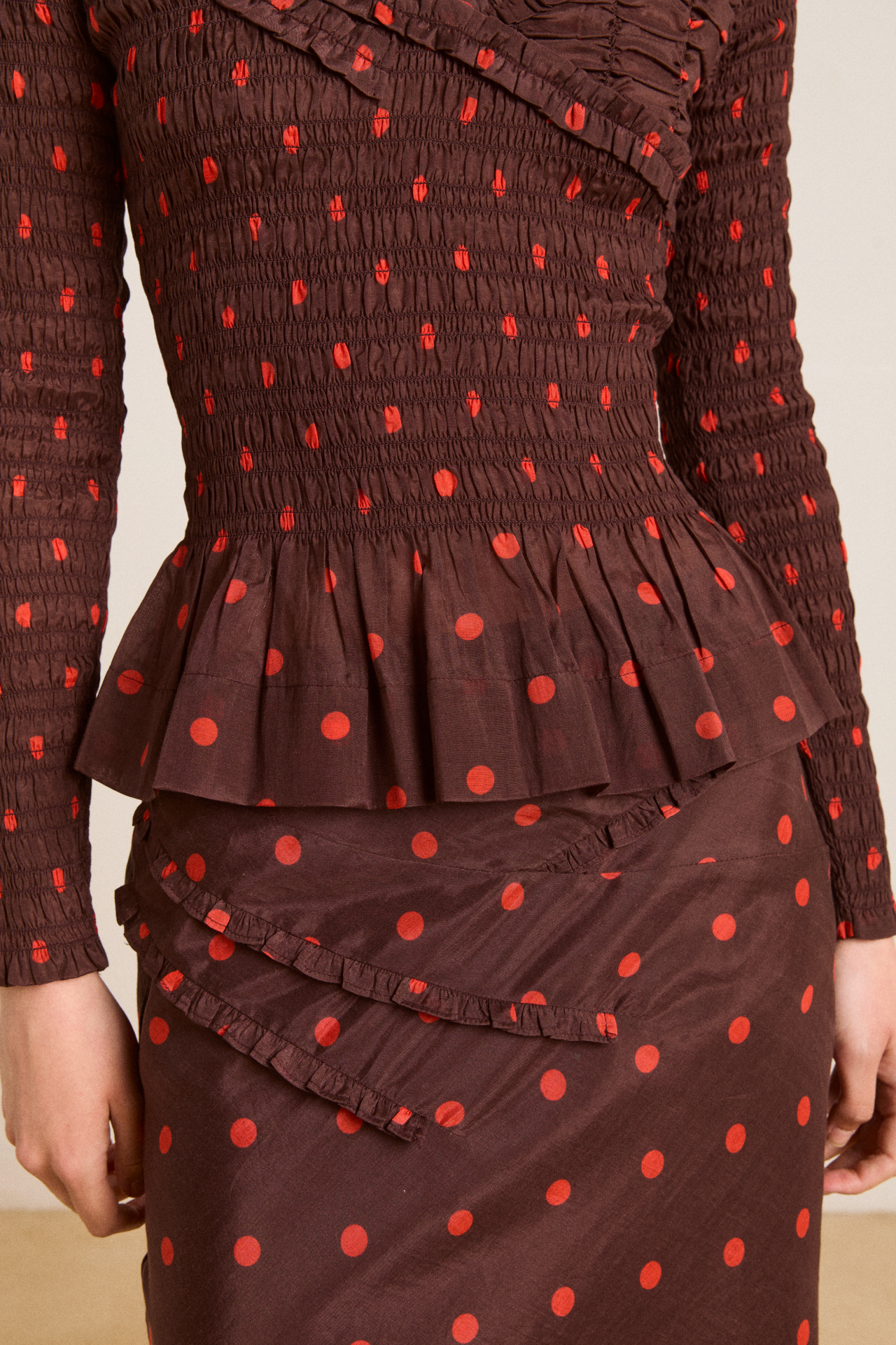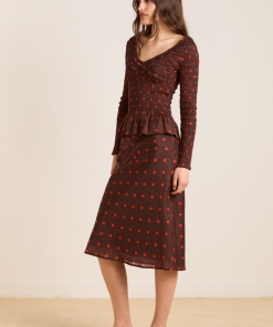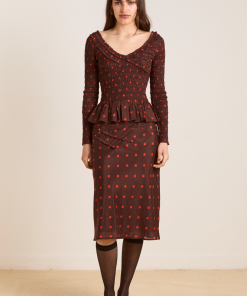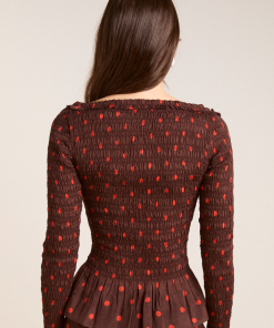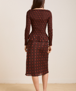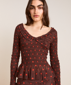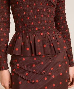 The Suri Shirred Sheer Blouse in burg/red polka dot features a shirred bodice and sleeves with ruffle detailing. Complete with a peplum hem and scoop neck, this blouse is as flattering as it is fun. Pair with our matching skirt and headscarf to complete the look.