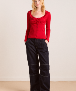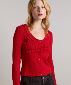The Varsha Cardigan in cherry is the epitome of easy wearing. Crafted from soft jersey rib fabric with a rounded neckline, and finished with sweet vintage-inspired ruffle detailing. The Varsha will be on high rotation.