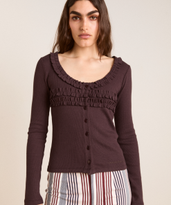 The Varsha Frilly Cardi in brown is the epitome of easy wearing. Crafted from soft jersey rib fabric with a rounded neckline, and finished with sweet vintage-inspired ruffle detailing. The Varsha will be on high rotation.