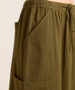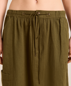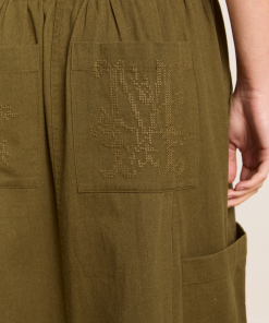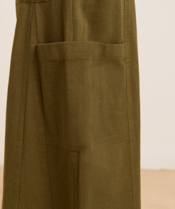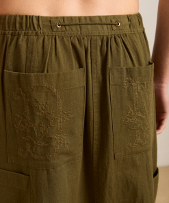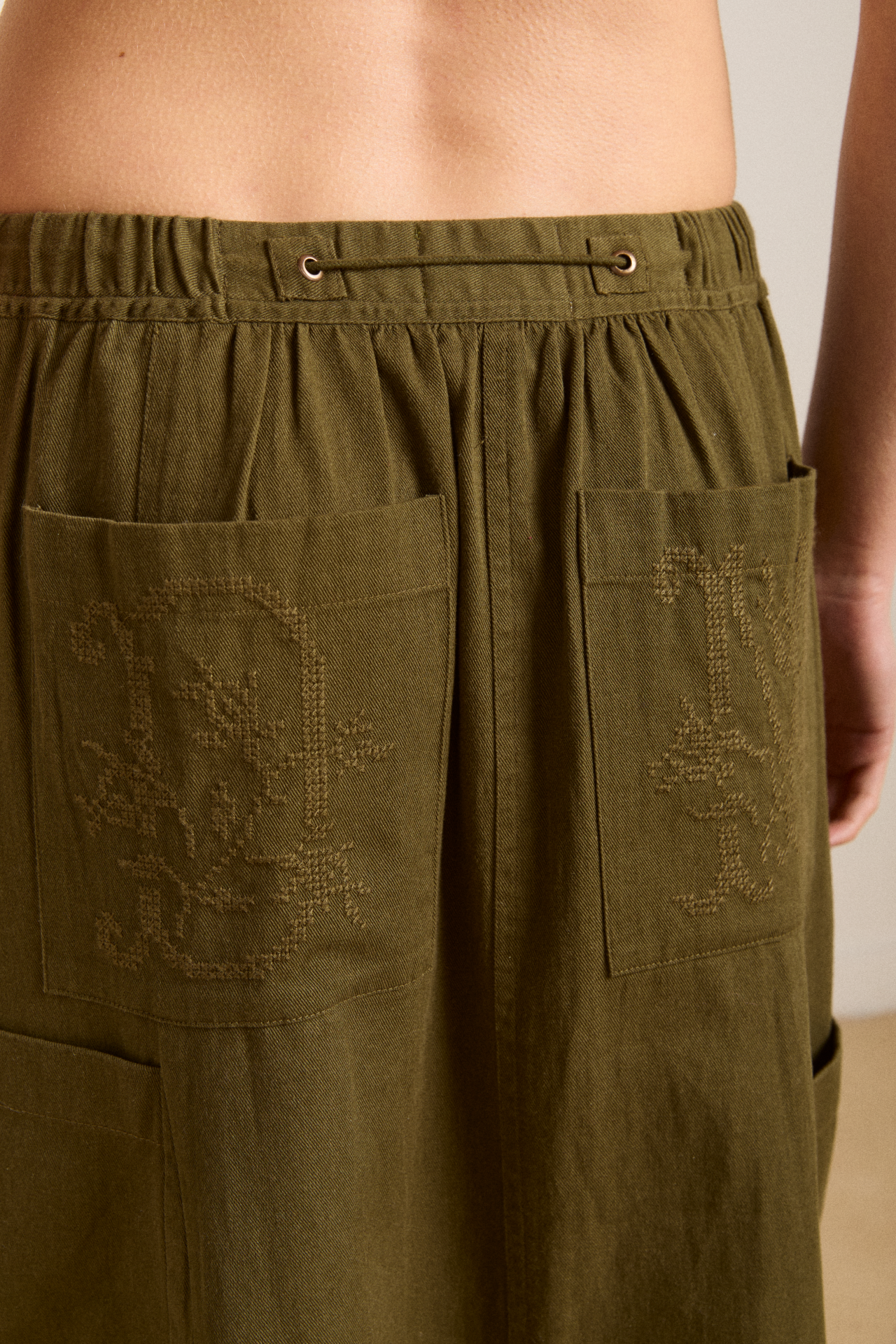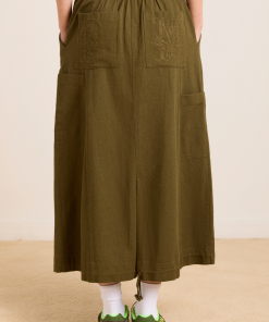 The classic utility skirt with a DM touch. The Vika Utility Midi skirt in olive is as functional as it is stylish. Crafted from 100% organic cotton and detailed with six handy pockets, it is perfect to take from day to night. Featuring DM embroidery on the back pockets and a tie detail at the waist.