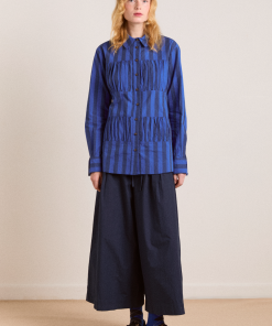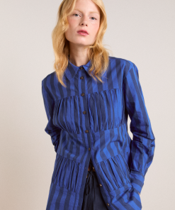 Fusing form and function, the Xenia Shirt in cobalt stripe is a standout piece. Crafted from 100% organic cotton, the Xenia features gathered panel detailing, with a button down front and all over cobalt stripe print.